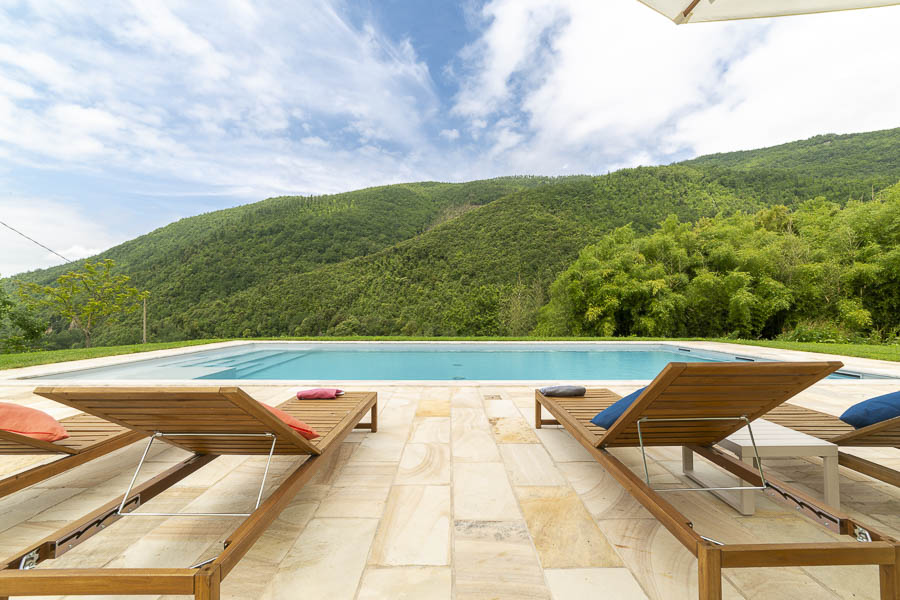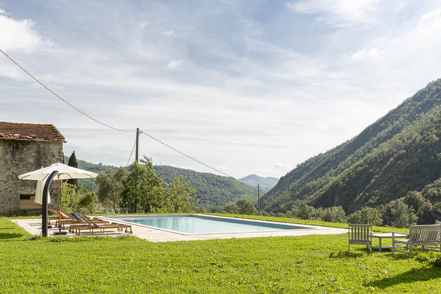 Set into the natural landscape, our 11×7 meter saltwater pool is a refreshing contrast to Lunigiana’s green backdrop. Swim or unwind with views of a bamboo grove and the mountain-lined horizon.