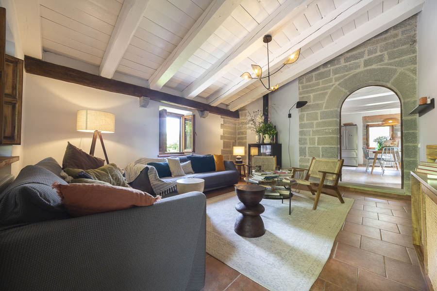 Designed with green boutique living in mind, the home blends exposed stone and wood with modern finishes. It offers four bedrooms and two flexible spaces—a study and cantina—that can accommodate extra guests. Three rooms feature queen beds; one has custom bunk beds with full-size singles, suitable for both kids and adults.